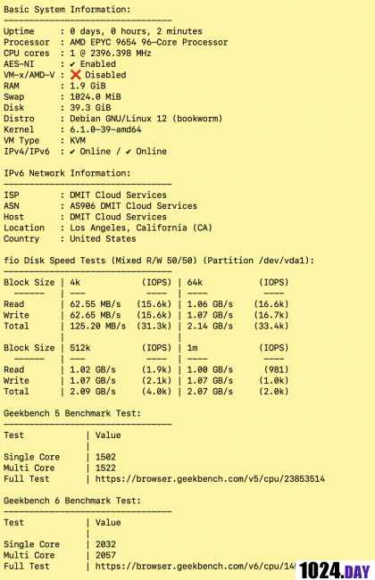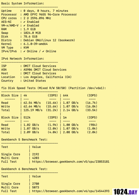 DMIT最近更新了新硬件,CPU陆续升级至EPYC 9005或9004,下面就来测试一下新升级到EPYC 9005的洛杉矶CN2套餐。