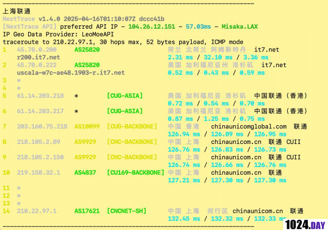 七舅姥爷 搬瓦工DC1机房,联通已从回程CN2路由变更为9929路由,也就是双程9929,现路由如下: 电信:双程CN2GIA 联通:双程9929 移动:双程CMIN2 测试IP: 104.224.153.2